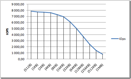 По этим результатам видно адекватную картину производительности чтения по причине того, что IBM DS включены через FC к серверу с нагрузкой у них потолок производительности – 4 GB. Почему они упираются в 3,5GB я объяснить не могу, но могу предположить что контроллеры просто не умеют забивать полные 4 GB в одиночку. Предположу что если загрузить 2 контроллера либо 2 порта на одном контроллере скорость подключения будет использована полностью.